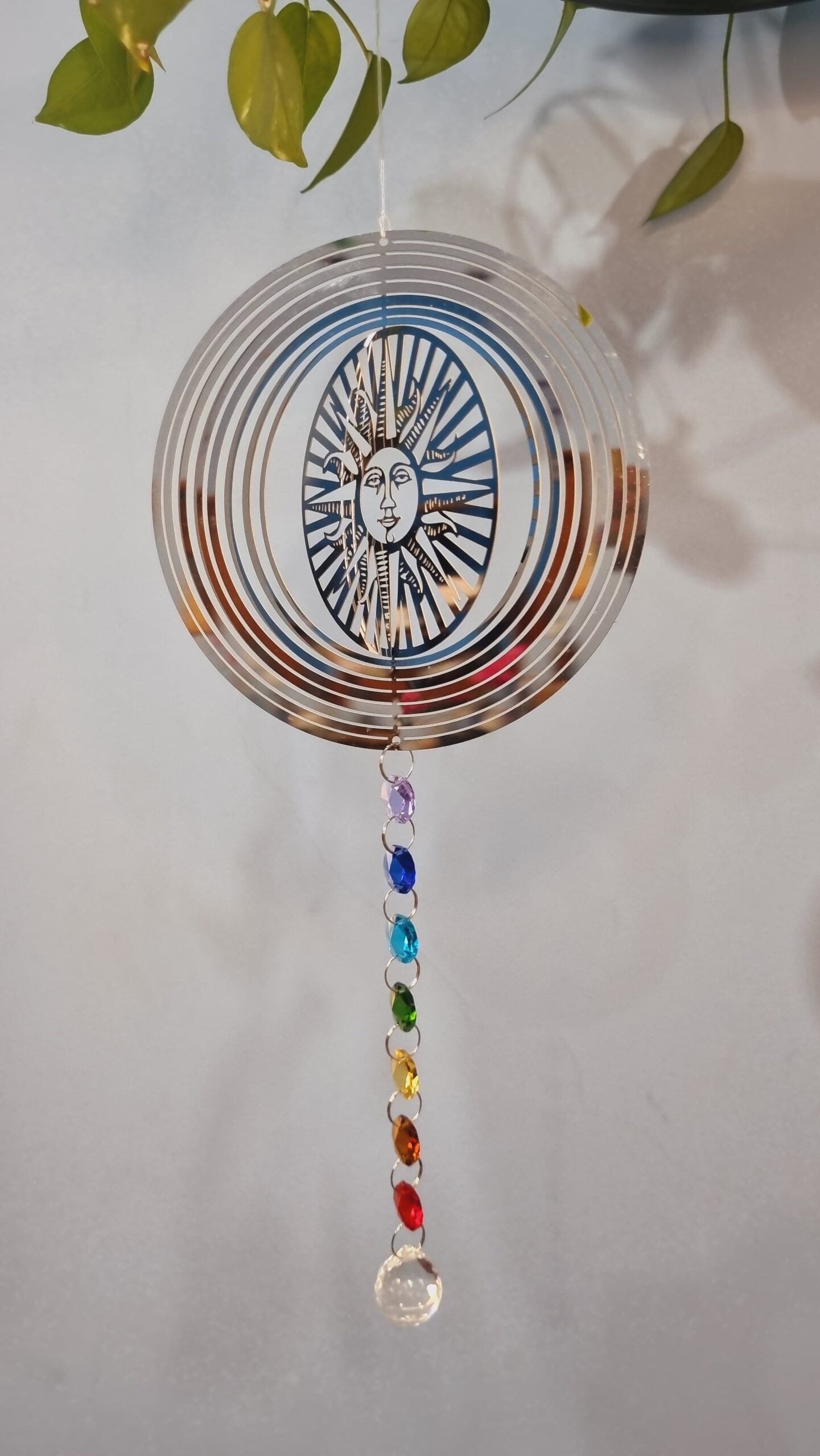 Feito em aço inoxidável e decorado com cristais nas cores dos chakras, ele gira com o vento ativando o fluxo de energia vital.
