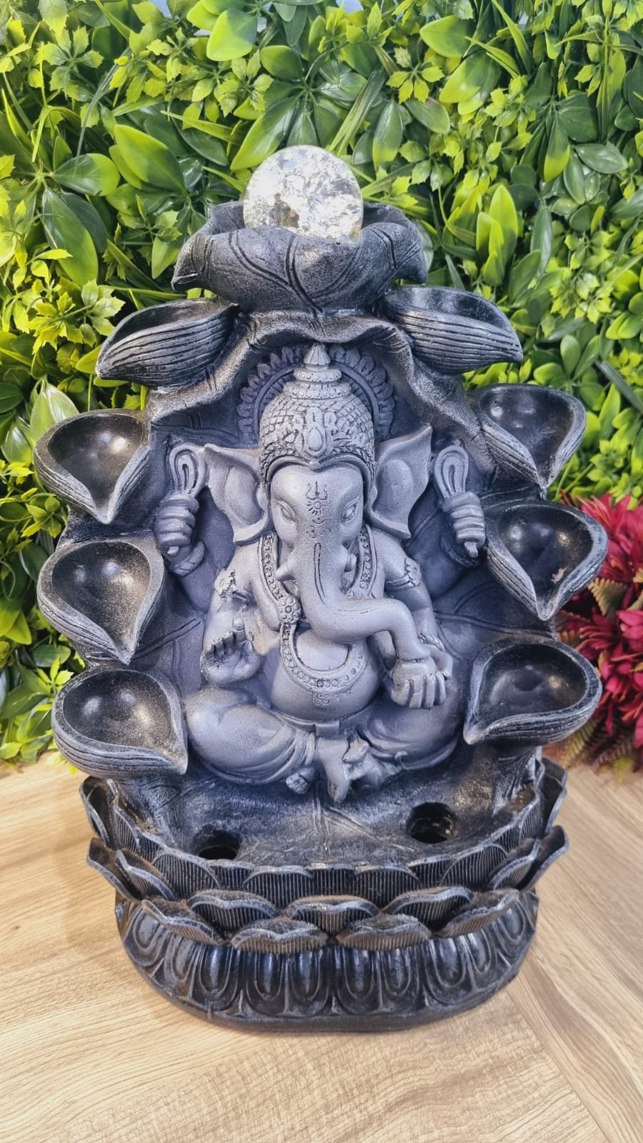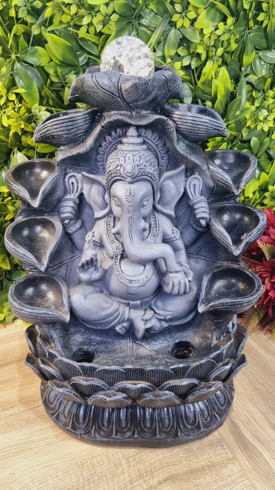 Uma peça que une a energia da prosperidade com o som relaxante da água em movimento. Ganesha, o removedor de obstáculos, traz sua presença sagrada em uma fonte delicada com esfera de cristal giratória e detalhes que encantam.