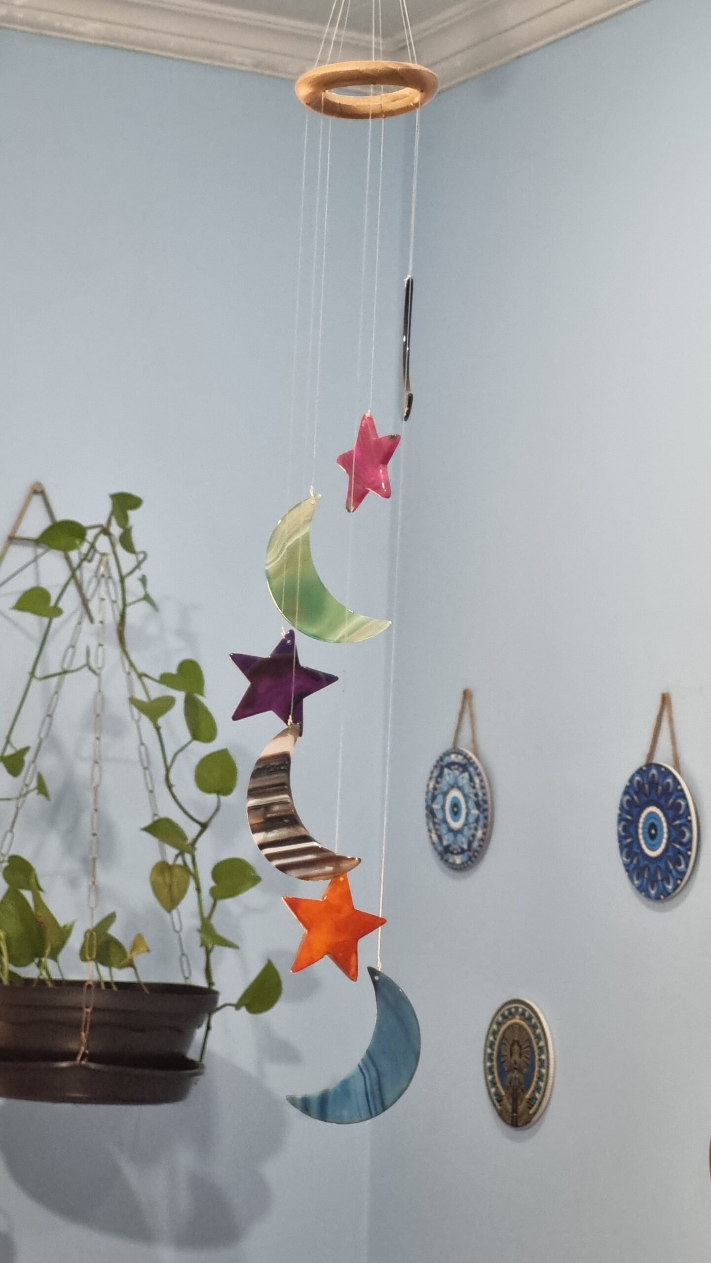 Delicado e encantador, este sino dos ventos combina o brilho natural dos cristais de ágata colorida com formas celestiais de luas e estrelas. Ao balançar com a brisa, ele cria um som suave que acalma, inspira e transforma o ambiente com um toque de magia e cor.